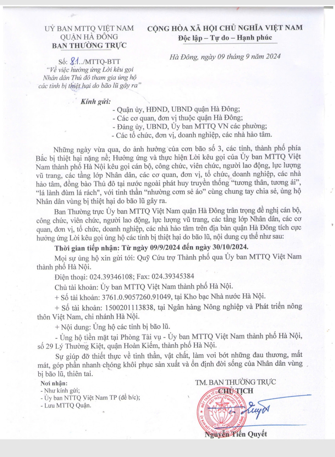 Hưởng ứng lời kêu gọi Nhân dân Thủ đô tham gia ủng hộ các tỉnh bị thiệt hại do bão lũ gây ra